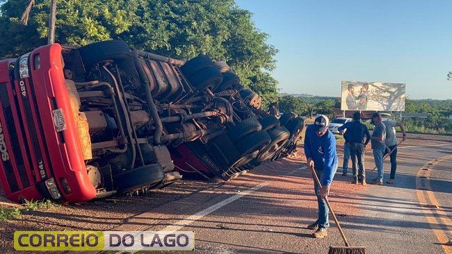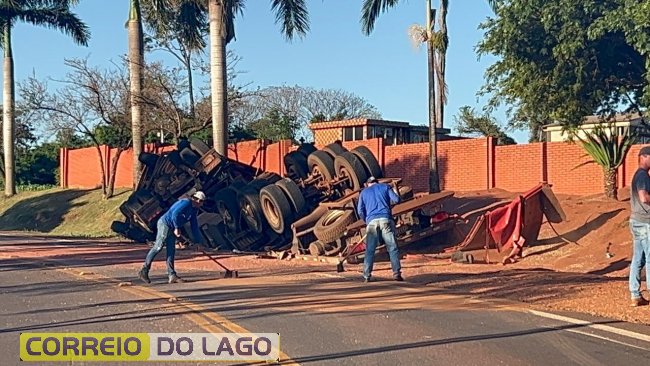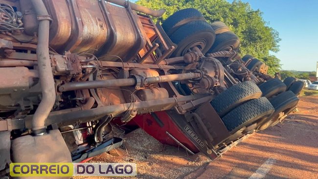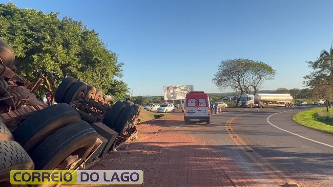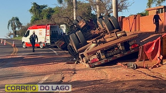 Na tarde desta terça-feira (14), uma carreta Scania modelo 124-420, com placas do Paraguai, tombou na rodovia PR-317, no trecho entre o distrito de Sub-Sede e Santa Helena.
