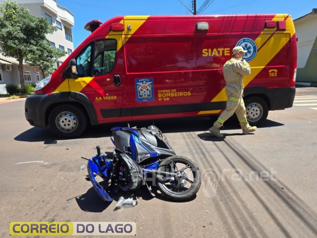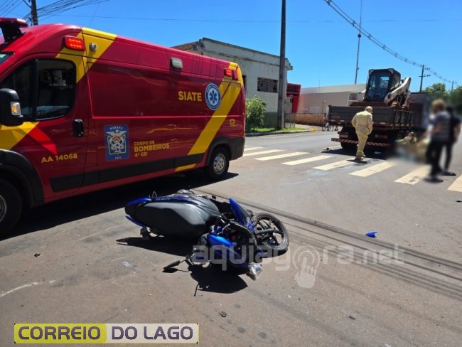 Um gravíssimo acidente de trânsito foi registrado por volta das 13h50 no centro de Marechal Cândido Rondon. Uma jovem de 28 anos sofreu ferimentos graves, a colisão envolveu uma motocicleta Yamaha Neo e um caminhão
