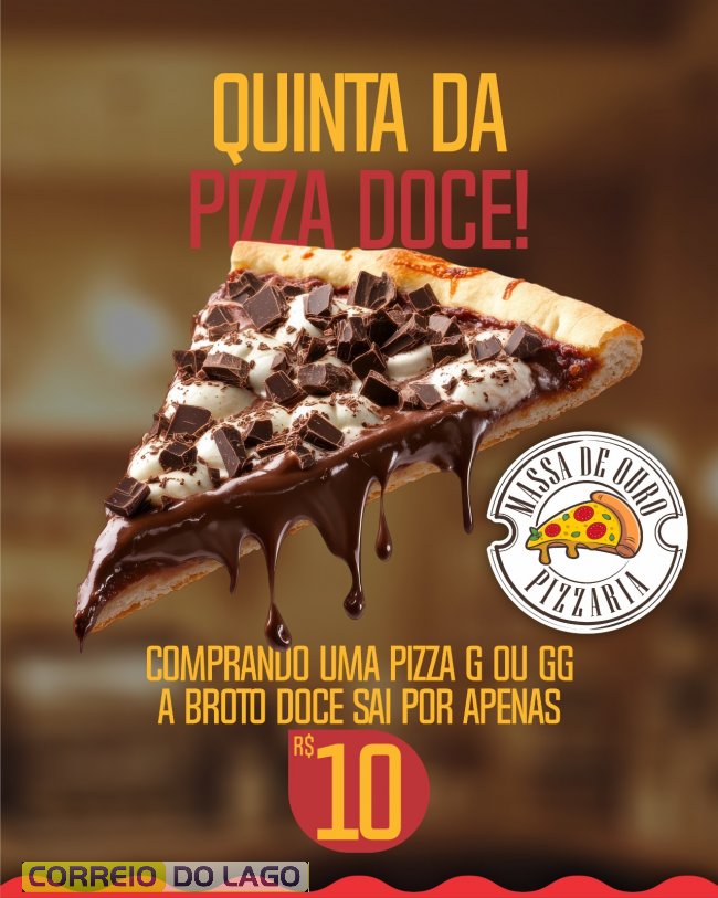 Quinta-feira é quase sexta e pede um sabor especial. Na compra de qualquer pizza tamanho G ou GG, a brotinho doce sai por apenas R$ 10. É a oportunidade de completar o pedido com aquele toque final que todo mundo gosta.