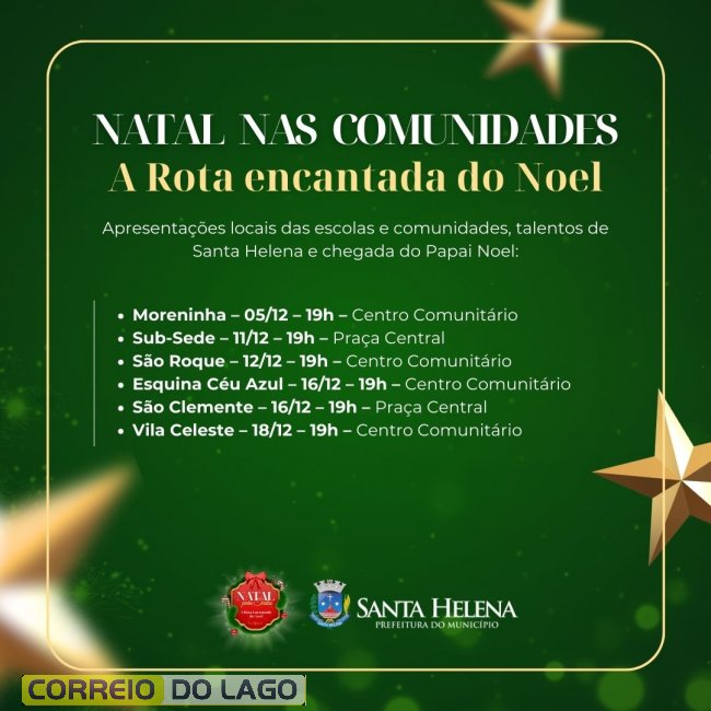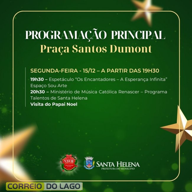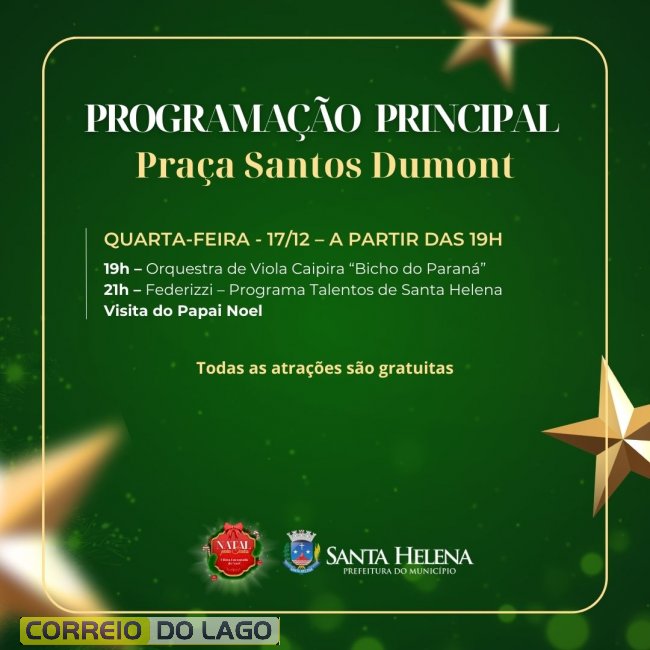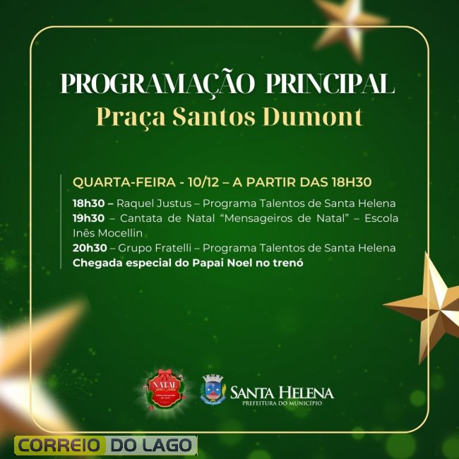 O prefeito de Santa Helena, Dinho Maraskin, convida a comunidade e visitantes da região a participarem das festividades. “Estamos preparando uma programação especial para celebrar o espírito natalino com alegria, união e encantamento. É um momento para reunir as famílias, valorizar nossos artistas locais e levar a magia do Natal a todos os cantos do Município. Toda a população está convidada a viver esse período especial conosco.”