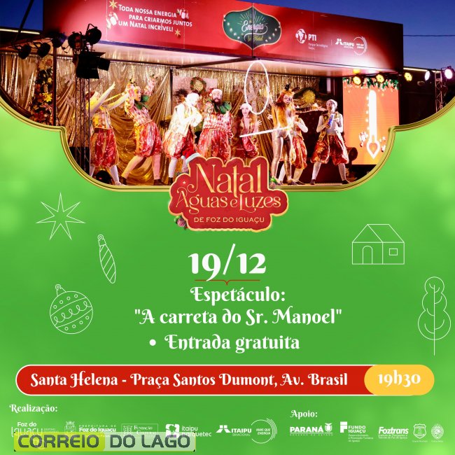 Na quinta-feira (19), o espetáculo fica por conta da Carreta de Natal da Itaipu Binacional. A peça tem como tema a oficina do Sr. Manoel, um ex-barrageiro que trabalhou na grandiosa construção de Itaipu e, hoje, dedica-se a uma oficina de brinquedos cheia de encantos.