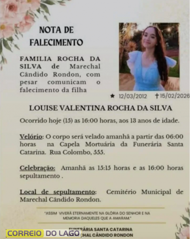 Familiares e amigos de Marechal Cândido Rondon e Santa Helena, comunicam com pesar o falecimento de Louise Valentina Rocha da Silva, ocorrido neste domingo (15), às 16h, aos 13 anos de idade.