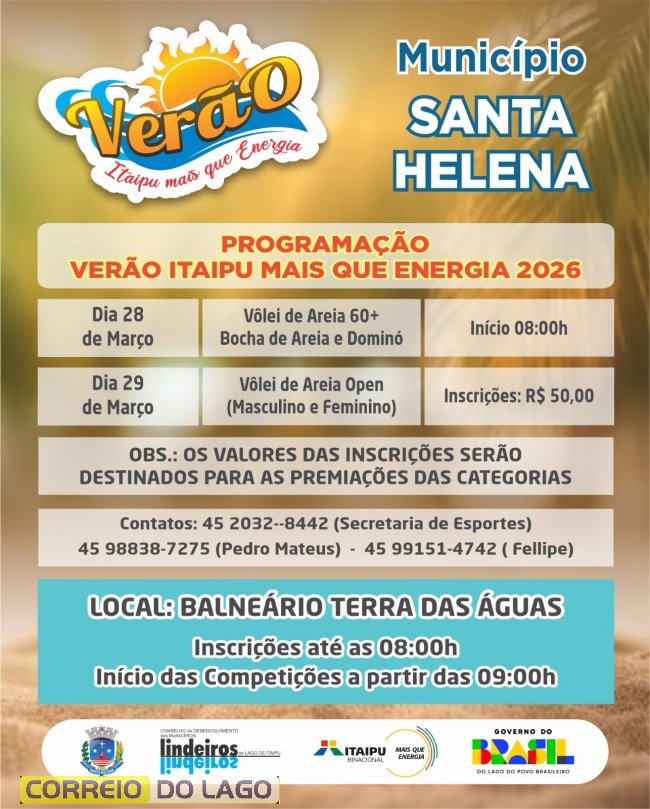 Neste fim de semana, as areias do Balneário Terra das Águas, em Santa Helena, serão palco de esporte e diversão em família. A partir deste sábado (28), a cidade recebe a edição 2026 do projeto Verão Itaipu Mais Que Energia, trazendo uma programação gratuita e repleta de atividades para todas as idades.