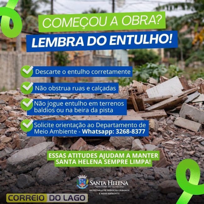 Com o aumento das obras e reformas, a Prefeitura de Santa Helena reforça um alerta importante à população: o descarte correto de entulhos é fundamental para manter a cidade organizada e segura. Restos de construção deixados em calçadas, ruas ou terrenos baldios prejudicam a limpeza urbana, afetam o meio ambiente e podem causar transtornos como obstrução da drenagem e riscos no trânsito.