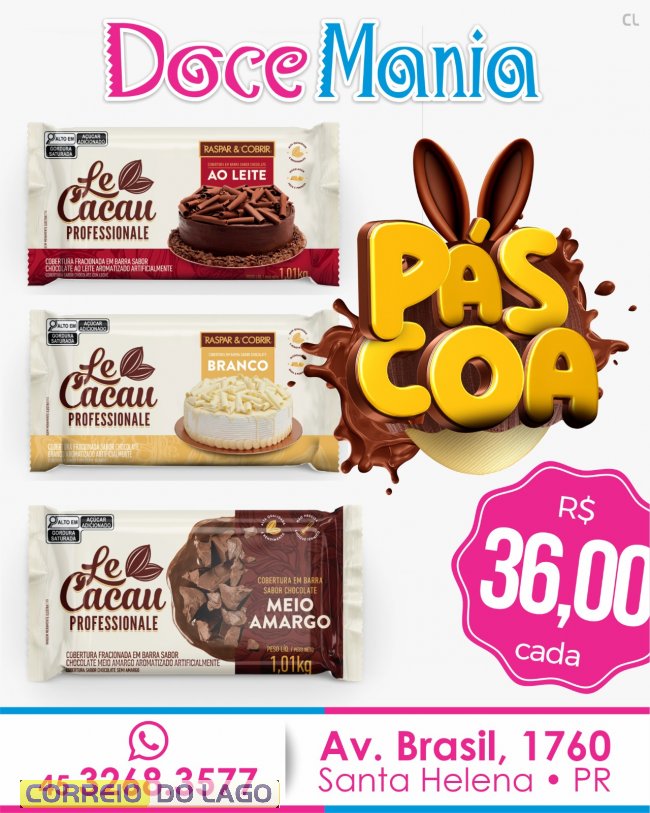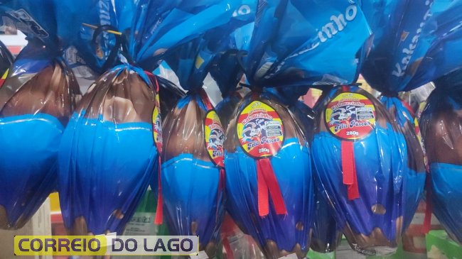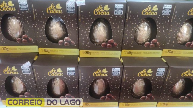 Entre os destaques, estão barras de chocolate da Cacau Show, de 1,01 kg, nos sabores ao leite, branco e meio amargo, por R$ 36 cada. Também estão disponíveis o ovo Poeme, de 500 g, por R$ 49,90, e barras de chocolate Garoto, de 500 g, por R$ 39,90. As compras podem ser parceladas em até três vezes no cartão.