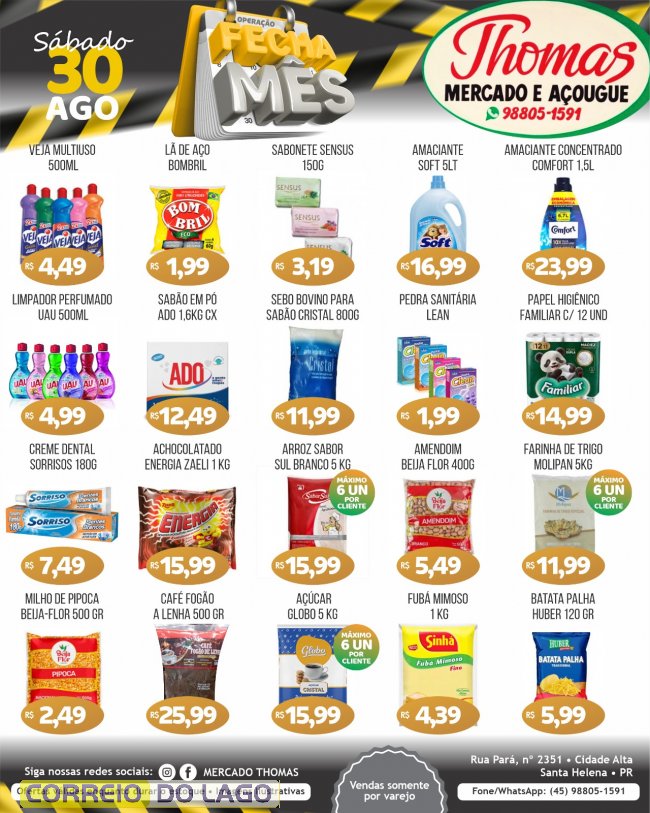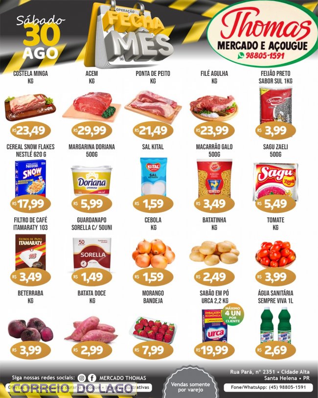 O Mercado Thomas de Santa Helena realiza neste sábado (30) a Operação Fecha Mês, com descontos especiais em carnes e diversos produtos. Clientes tem a oportunidade de economizar nas compras do fim de mês, com preços reduzidos em itens de mercearia e cortes de carne selecionados, válidos apenas durante o dia.