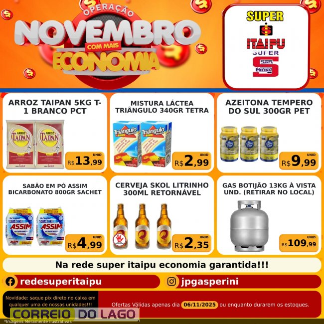 Começou a operação novembro com mais economia nos supermercados Super Itaipu e Super Santa Helana. Nesta quinta-feira (6), os clientes podem aproveitar uma série de ofertas especiais em diversos setores, com preços ainda mais baixos para garantir economia nas compras do dia a dia. As promoções são válidas somente hoje ou enquanto durarem os estoques.