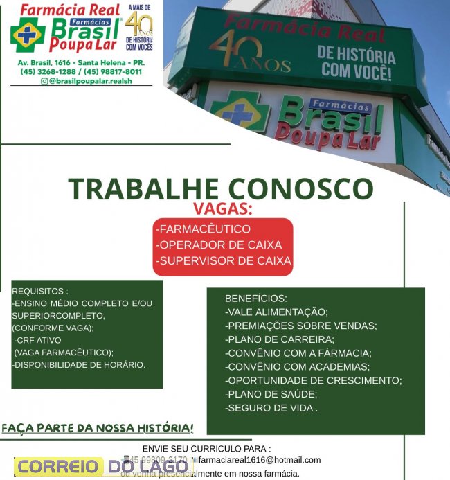 A Farmácia Real - Rede Brasil Poupa Lar, em Santa Helena, está com novas oportunidades de trabalho abertas para quem busca colocação no mercado ou crescimento profissional. As vagas disponíveis são para farmacêutico, operador de caixa e supervisor de caixa.
