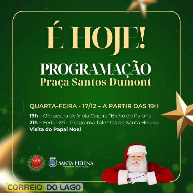A Praça Santos Dumont será palco, nesta quarta-feira (17), da última noite de apresentações da programação central do Natal Para Todos – A Rota Encantada do Noel, em Santa Helena. O encerramento promete uma noite especial com atrações culturais e a presença do Papai Noel, reunindo famílias para celebrar a reta final da edição 2025 do evento.