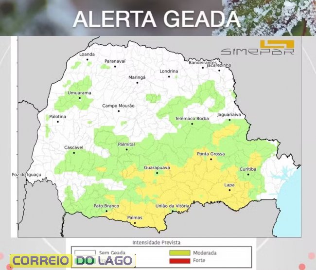 "No domingo, o frio ganha ainda mais intensidade, com possibilidade de geada fraca em todo Paraná, com exceção do litoral, de moderada intensidade no sudoeste, centro-sul, sudeste, Campos Gerais e região metropolitana de Curitiba (RMC), e até mesmo de forte intensidade em pontos do extremo-sul paranaense. Novamente se esperam marcas negativas no centro-sul e sudeste do estado. Na capital, a previsão é de até 2 °C nos termômetros", aponta o Simepar.