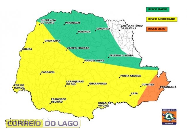 O Simepar alerta para o risco de tempestades pontualmente intensas, com chuva forte em curto espaço de tempo, rajadas de vento mais intensas, descargas elétricas e granizo. Há possibilidade de enxurradas, alagamentos, transbordamento de córregos, destelhamentos, danos em plantações, redução da visibilidade nas estradas e interrupções no fornecimento de energia.