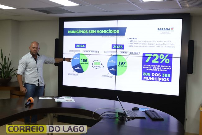 Com isso, praticamente a metade dos municípios paranaenses passou 2025 sem registro de homicídio doloso. O número de cidades sem ocorrência desse crime aumentou 19% em relação ao ano passado, ampliando a área do Estado onde esse tipo de violência não apareceu.
