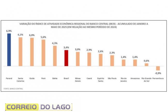 O Paraná registrou o maior crescimento da atividade econômica do Brasil nos primeiros cinco meses de 2025, com 6,9%, segundo dados do Banco Central. É o dobro do mesmo resultado nacional no período, que foi de 3,4% (diferença de 3,5 pontos percentuais). O comparativo é com o mesmo período do ano anterior. Os dados foram reunidos pelo Instituto Paranaense de Desenvolvimento Econômico e Social (Ipardes).