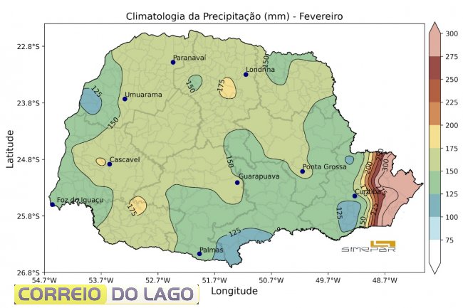 A climatologia de fevereiro ainda registra acumulados de chuva entre 100 e 140 mm no extremo Oeste, e entre 110 e 140 mm no Sudeste do Paraná. Da Região Metropolitana de Curitiba até o Litoral, os acumulados em fevereiro aumentam progressivamente de 150 até 360 mm. “As áreas da costa litorânea são as que registram, historicamente, maior acumulado de chuva em fevereiro”, ressalta Munhoz.
