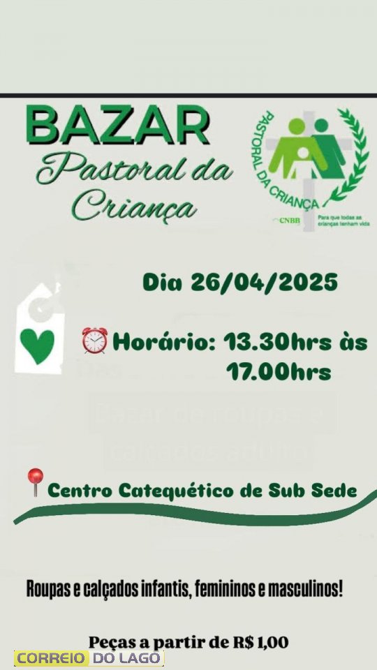 No bazar, estarão disponíveis peças infantis, femininas e masculinas, todas em bom estado, destinadas a atender pessoas da comunidade e região. A iniciativa tem como objetivo arrecadar recursos para fortalecer as ações da Pastoral da Criança, que há anos desenvolve um trabalho voltado ao cuidado com gestantes, crianças e famílias em situação de vulnerabilidade.