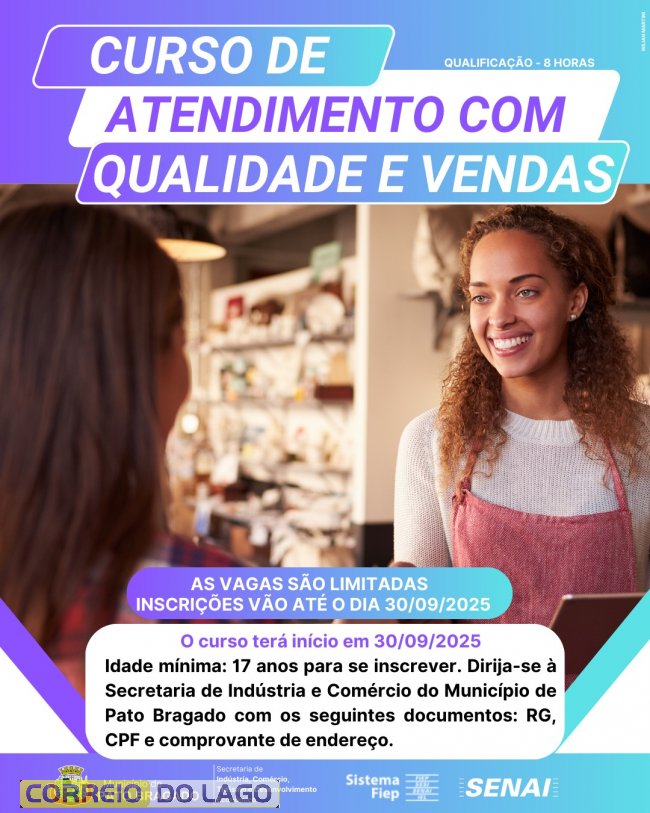 Pato Bragado está promovendo uma nova oportunidade de qualificação profissional para seus cidadãos. Estão abertas as inscrições para os cursos "Atendimento com Qualidade" e "Vendas". Essas formações são ideais para quem deseja aprimorar suas habilidades e se destacar no mercado de trabalho, especialmente nas áreas de atendimento ao cliente e vendas.