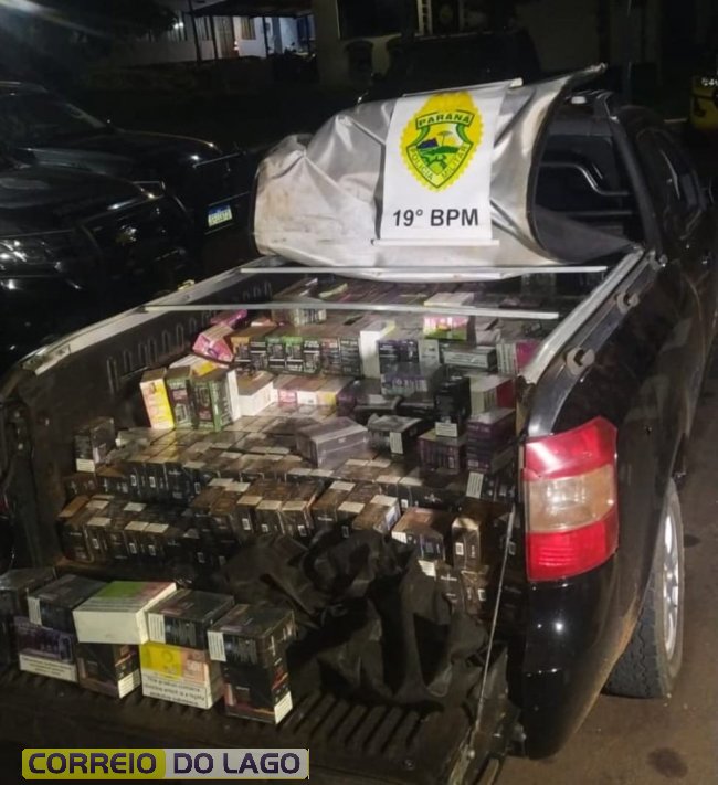 Na vistoria veicular, os policiais constataram que no compartimento de carga havia aproximadamente 3 mil cigarros eletrônicos (vapes) de diversas marcas, caracterizando crime de contrabando.