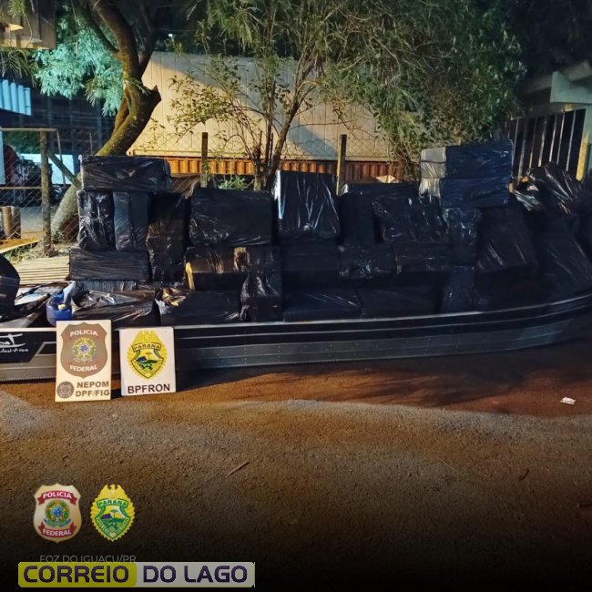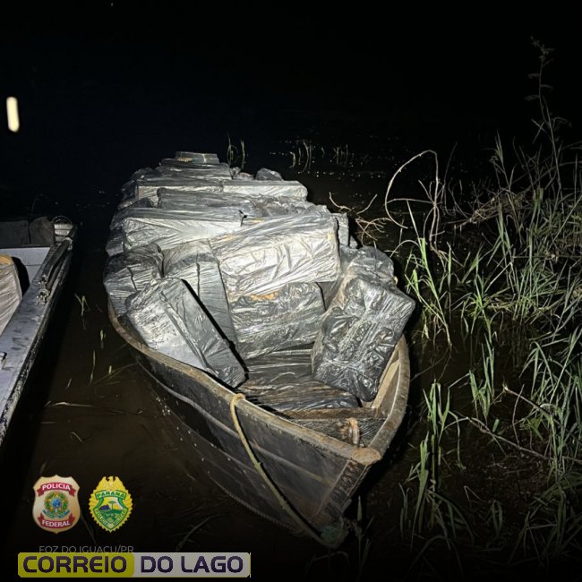 Policiais federais e policiais militares apreenderam mais uma carga de cigarros contrabandeados do Paraguai, após a interceptação de uma embarcação que atravessava o lago de Itaipu, na noite desta quarta-feira (19), na região do município de Itaipulândia.