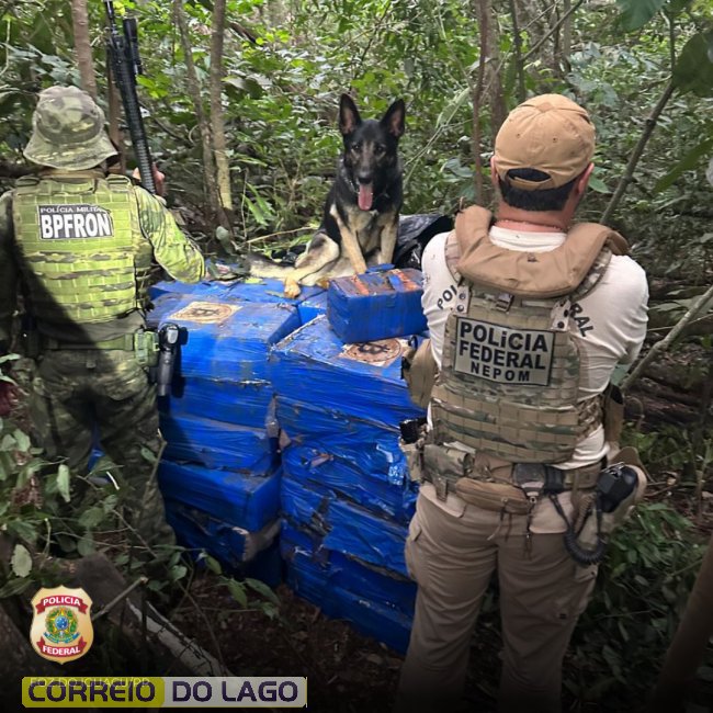 Durante patrulhamento por trilhas que dão acesso ao lago, rotas comumente utilizadas por contrabandistas e traficantes, os cães farejadores indicaram um ponto suspeito. No local, foram encontrados dezenas de fardos de maconha empilhados e prontos para transporte.