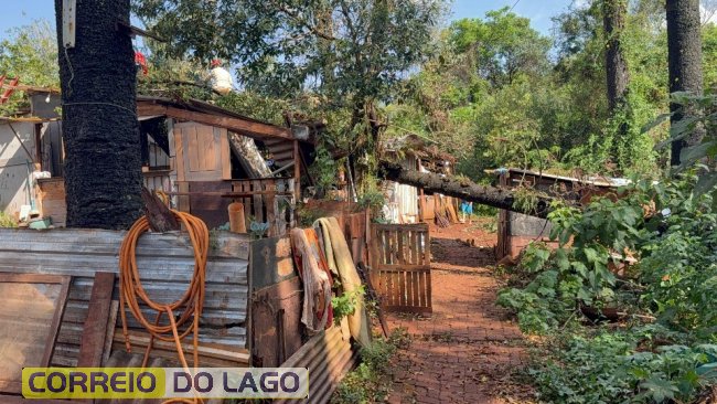 Pinheiro cai sobre casas e causa estragos em Cascavel
