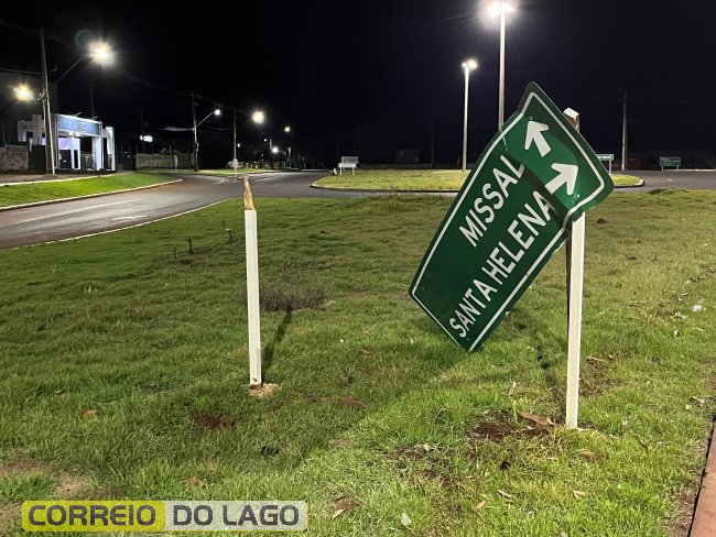 Uma placa de sinalização foi danificada na noite deste domingo (15), no trevo de acesso à cidade, localizado próximo ao posto da Polícia Rodoviária Estadual (PRE), em Santa Helena.