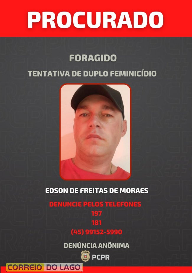 A Polícia Civil de Toledo divulgou nesta quarta-feira (11) que está à procura de Edson de Freitas de Moraes, apontado como autor de um Duplo Feminicídio Tentado ocorrido no último dia 29 de janeiro, no bairro Jardim Europa, em Toledo.