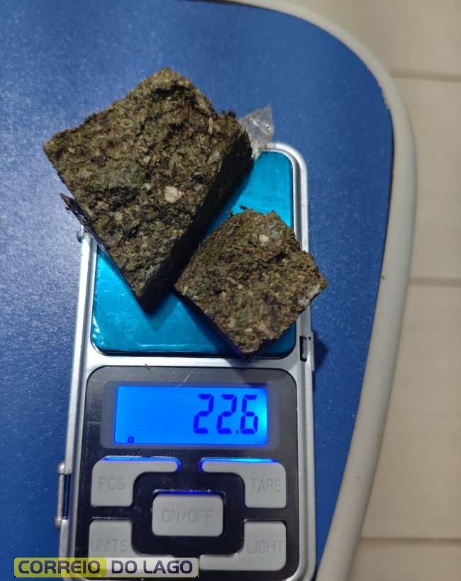 No local, o homem continuou desobedecendo ordens da equipe e demonstrando comportamento agressivo, sendo necessário o uso de algemas para garantir a segurança dos envolvidos. Durante a abordagem, os policiais encontraram no bolso do indivíduo uma porção de substância análoga à maconha. Em seguida, com a autorização da esposa do conduzido, os agentes realizaram buscas no interior da residência e localizaram mais uma porção semelhante sobre a mesa da cozinha. As duas quantidades totalizaram cerca de 22 gramas da droga.