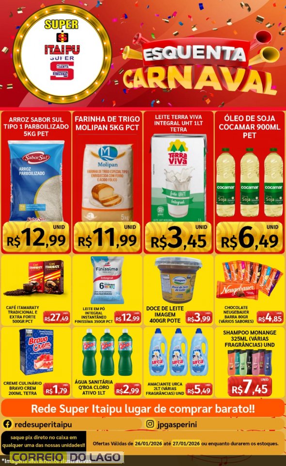 Nesta segunda-feira (26), o clima de Pré e Esquenta Carnaval já tomou conta do Super Itaipu e do Super Santa Helena, com ofertas especiais que garantem a melhor economia para sua semana. É a oportunidade ideal para antecipar as compras, aproveitar preços imbatíveis e fazer tudo com tranquilidade e variedade.