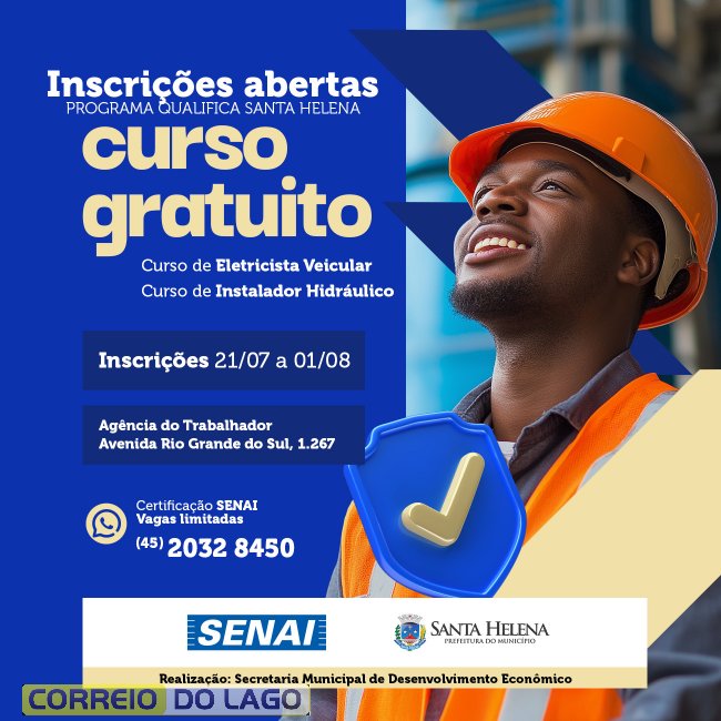 A Secretaria Municipal de Desenvolvimento Econômico, por meio do programa Qualifica Santa Helena e em parceria com o SENAI, abre na próxima segunda-feira (21) as inscrições para dois cursos gratuitos de qualificação profissional: Instalador Hidráulico e Eletricista Veicular.