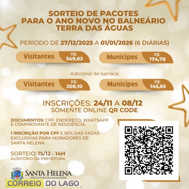 O pacote inclui seis diárias, com início às 8h de 27 de dezembro de 2025 e término às 18h de 1º de janeiro de 2026. O valor para visitantes é de R$ 349,62, enquanto moradores de Santa Helena pagam R$ 174,78. Quem desejar instalar barraca junto ao quiosque terá cobrança adicional: