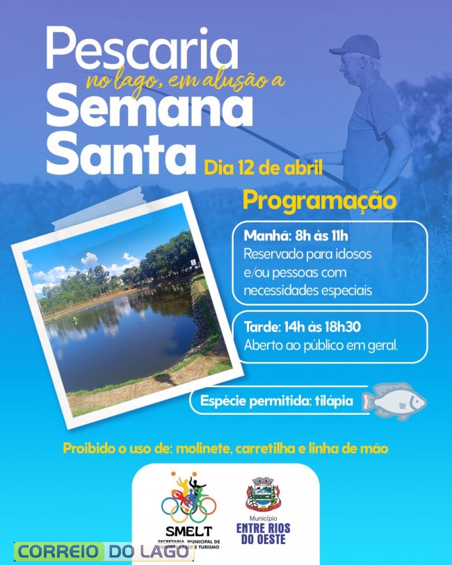 A Prefeitura de Entre Rios do Oeste, por meio da Secretaria Municipal de Esportes, Lazer e Turismo (SMELT), convida toda a população para participar do evento "Pesque e Leve", que acontecerá no dia 12 de abril, no Lago Municipal. A iniciativa, realizada em alusão à Semana Santa, tem como objetivo proporcionar uma experiência de lazer e incentivar o acesso ao pescado para as famílias do município.