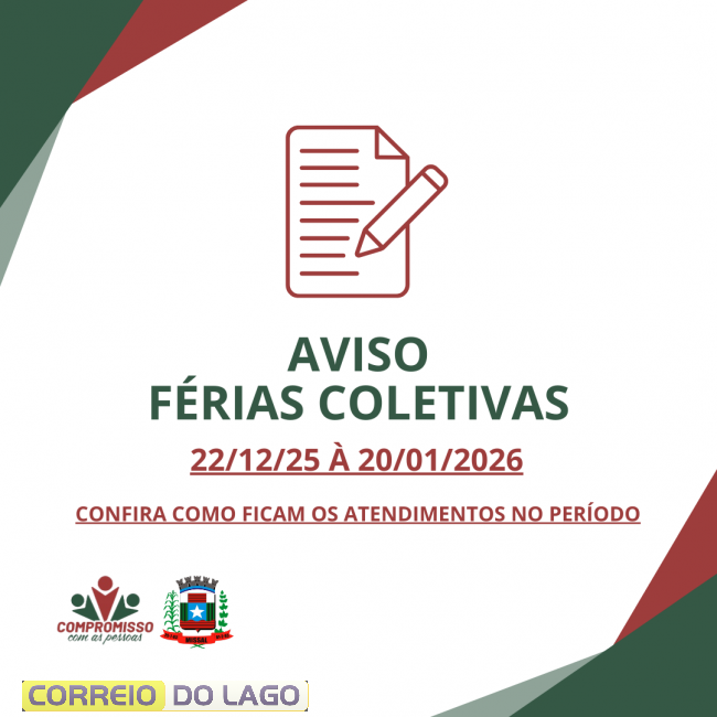 Durante o período de fim de ano, não haverá atendimento nas repartições públicas, devido a Ponto Facultativo, nos dias 26 de dezembro (sexta-feira), 31 de dezembro (quarta-feira) e 02 de janeiro de 2026 (sexta-feira).