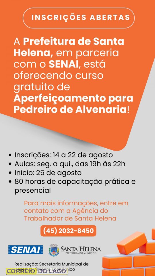 A Prefeitura de Santa Helena, por meio da Secretaria Municipal de Desenvolvimento Econômico, em parceria com o SENAI – Serviço Nacional de Aprendizagem Industrial –, está oferecendo gratuitamente o curso de Aperfeiçoamento para Pedreiro de Alvenaria.