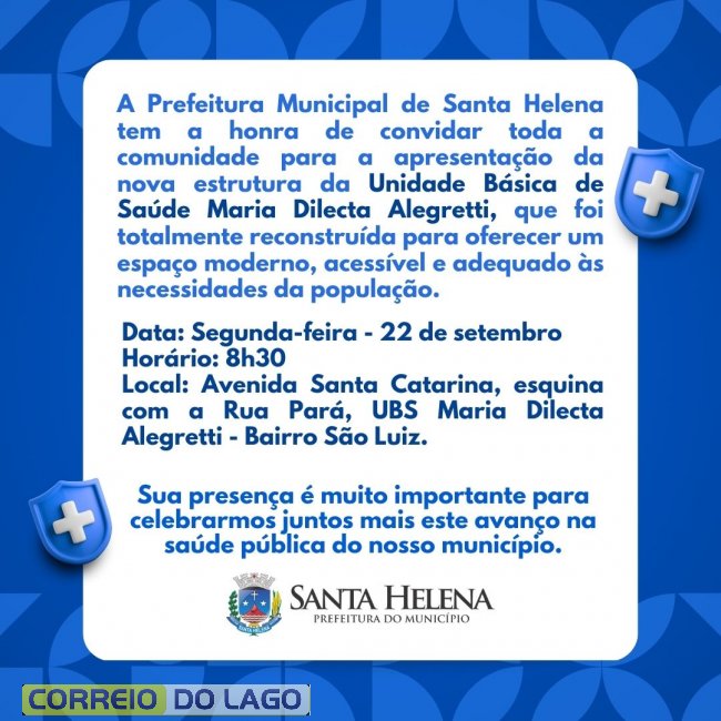 A Prefeitura Municipal de Santa Helena tem a satisfação de convidar toda a comunidade para a apresentação da nova estrutura da Unidade Básica de Saúde (UBS) Maria Dilecta Alegretti, totalmente reconstruída para oferecer um espaço moderno, acessível e adequado às necessidades da população.