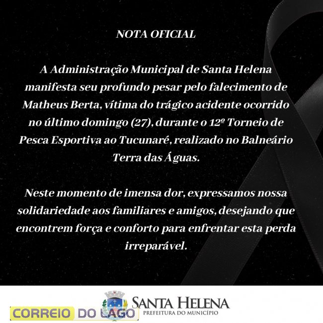 A Administração Municipal de Santa Helena manifesta seu profundo pesar pelo falecimento de Matheus Berta, vítima do trágico acidente ocorrido no último domingo (27), durante o 12º Torneio de Pesca Esportiva ao Tucunaré, realizado no Balneário Terra das Águas.