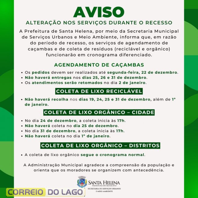 A Prefeitura de Santa Helena, por meio da Secretaria Municipal de Serviços Urbanos e Meio Ambiente, informa que, em razão do período de recesso de fim de ano, os serviços de agendamento de caçambas e de coleta de resíduos recicláveis e orgânicos terão funcionamento em cronograma diferenciado.