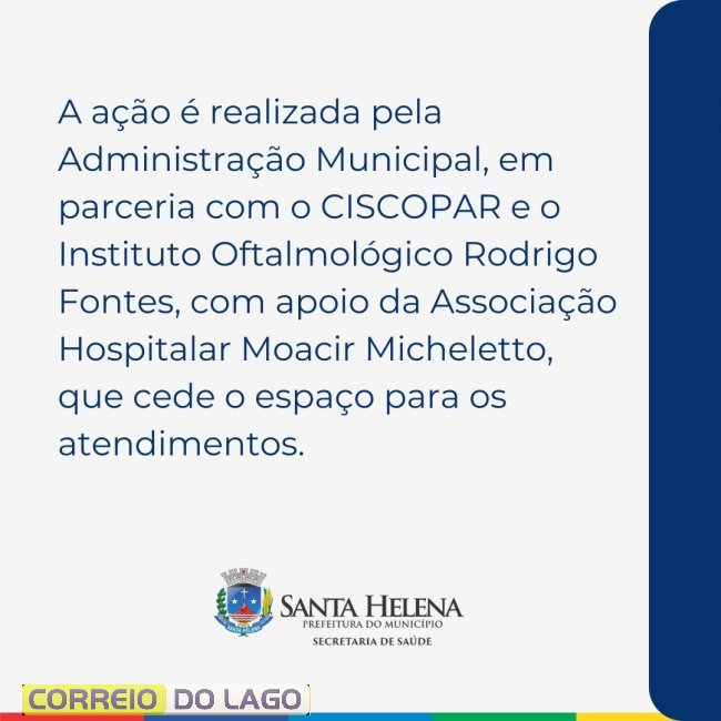 A Prefeitura de Santa Helena, por meio da Secretaria Municipal de Saúde, inicia nesta semana um mutirão de consultas oftalmológicas com o objetivo de ampliar o acesso da população aos atendimentos especializados e garantir maior agilidade nos diagnósticos e encaminhamentos. Nos dias 16, 17 e 18 de janeiro, estão previstas 360 consultas oftalmológicas, contemplando pacientes previamente agendados pela Rede Municipal de Saúde.