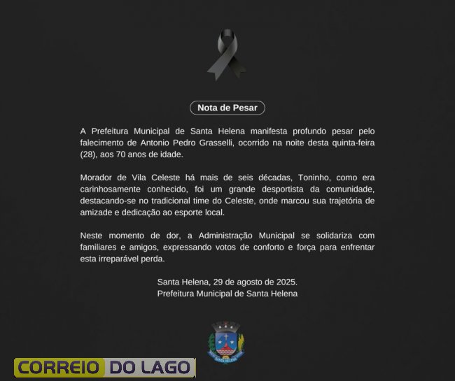 A Prefeitura Municipal de Santa Helena manifesta profundo pesar pelo falecimento de Antonio Pedro Grasselli, ocorrido na noite desta quinta-feira (28), aos 70 anos de idade.