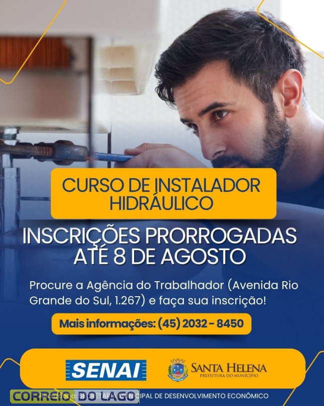 Prefeitura de Santa Helena prorroga inscrições para curso gratuito de Instalador Hidráulico até 8 de agosto