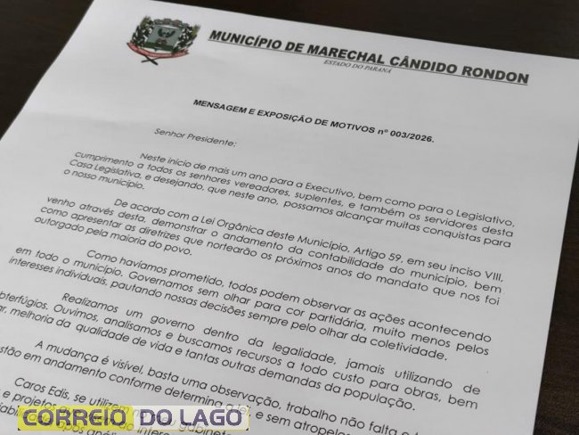 A prefeitura de Marechal Cândido Rondon encerrou o exercício financeiro de 2025 com um superávit financeiro de recursos livres de R$ 68,4 milhões, conforme dados apresentados na Mensagem e Exposição de Motivos nº 003/2026, encaminhada à Câmara de Vereadores pelo prefeito Adriano Backes e pelo vice-prefeito Vanderlei Sauer. O documento deve ser lido na sessão ordinária desta segunda-feira, dia 2 de fevereiro.