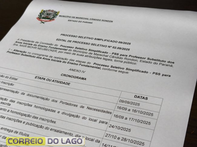 De acordo com o Edital nº 02.09/2025, a presidente da Comissão do PSS, Nair Mohr Neubecker, tornou pública a alteração no cronograma de realização das etapas do Processo Seletivo Simplificado nº 09/2025, destinado à contratação de professores substitutos dos anos iniciais do ensino fundamental. As inscrições seguem até 16 de outubro, e a prova escrita e entrega de títulos acontecerão no dia 23 de novembro de 2025. O resultado final será publicado em 11 de dezembro, com homologação prevista para 16 de dezembro.
