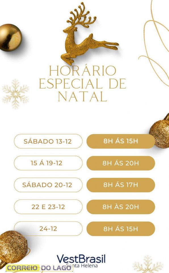 O clima de Natal já tomou conta de Santa Helena, e a VestBrasil preparou uma programação especial de horários para atender melhor seus clientes. De 15 a 19 de dezembro, a loja funcionará das 8h às 20h; no sábado, dia 20, das 8h às 17h; nos dias 22 e 23, das 8h às 20h; e no dia 24, véspera de Natal, das 8h às 15h.
