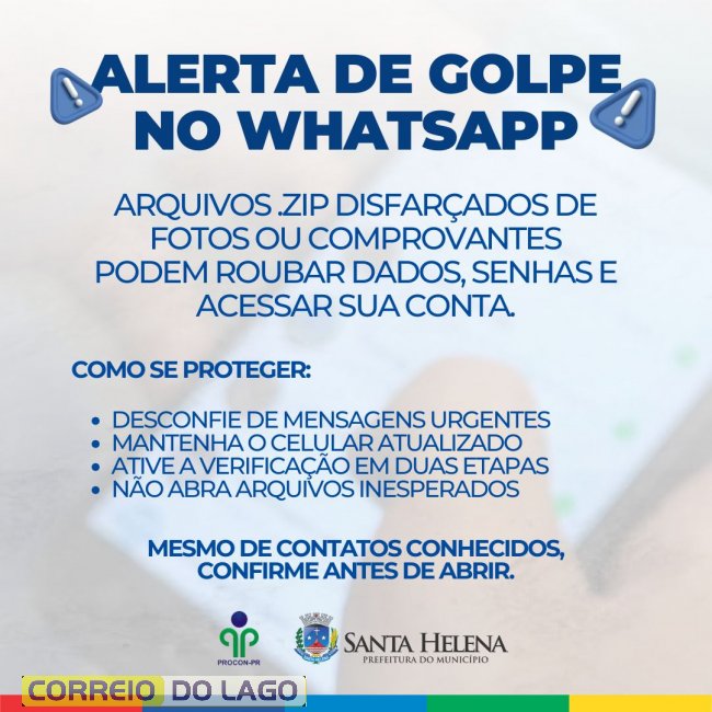 O Procon Santa Helena emitiu um alerta à população sobre um novo golpe que vem sendo aplicado por criminosos por meio do aplicativo WhatsApp. A fraude consiste no envio de arquivos no formato .ZIP, que se passam por fotos, comprovantes de pagamento, documentos ou outros conteúdos aparentemente confiáveis.