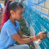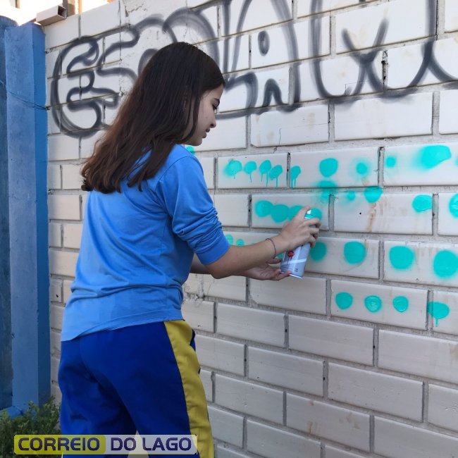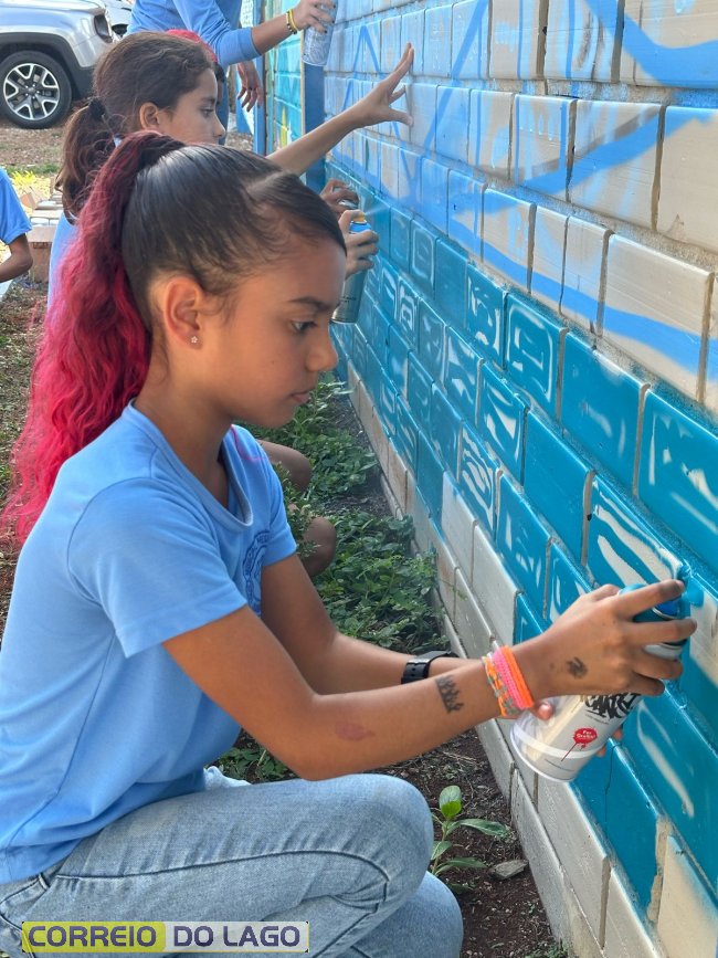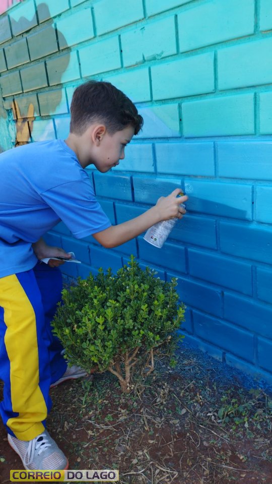 Sob a orientação do professor de grafite Isaac, os alunos aprenderam técnicas de manuseio e pintura com tinta spray, experimentando cores e texturas. A atividade estimulou a criatividade e resultou em uma obra coletiva no muro de entrada da escola, tornando o espaço mais colorido e expressivo.