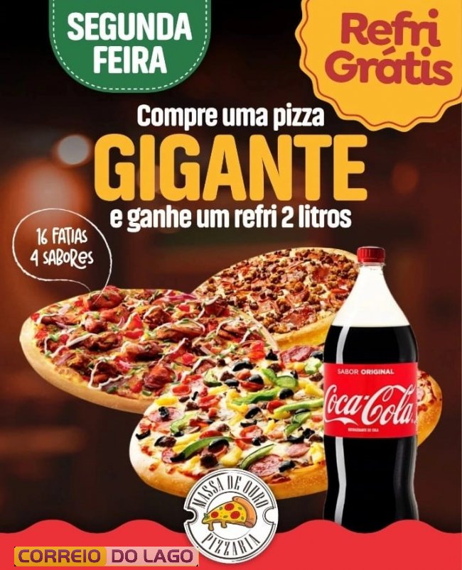 Nesta segunda-feira (17), a Pizzaria Massa de Ouro oferece uma promoção especial: na compra de uma pizza tamanho GG, com ou sem borda, o cliente ganha um refrigerante de 2 litros gratuitamente, escolhendo o sabor de sua preferência.