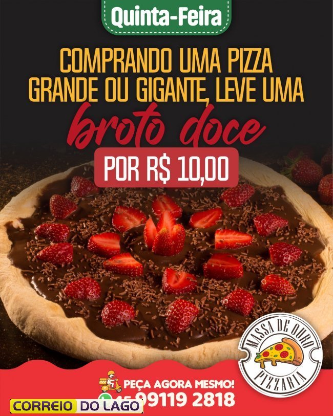 Nesta quinta-feira (22), a Pizzaria Massa de Ouro em Santa Helena preparou uma promoção que vai adoçar a noite dos clientes. Quem comprar uma pizza grande ou gigante pode levar uma pizza broto doce por apenas R$10, uma oportunidade para saborear mais opções por menos.