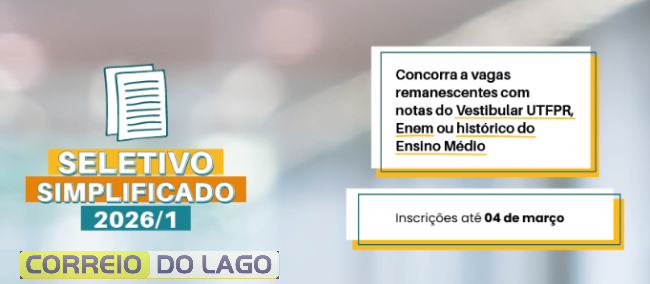 A Universidade Tecnológica Federal do Paraná (UTFPR) prorrogou as inscrições do Seletivo Simplificado para ingresso no primeiro semestre de 2026. O processo possibilita a concorrência em 62 cursos que tiverem vagas disponíveis, após a conclusão do Sistema de Seleção Unificada (Sisu) e do Vestibular UTFPR, em 11 cidades do Paraná. As inscrições serão realizadas gratuitamente até 4 de março.