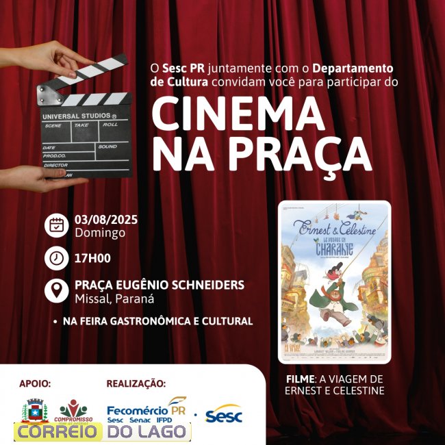 A Feira Gastronômica e Cultural em Missal está prevista para ocorrer no dia 03 de agosto de 2025, na Praça Eugênio Schneiders. E a atração do evento será o Cinema ao Ar Livre – Mostra Itinerante desenvolvido pelo SESC-PR em parceria com os municípios sedes. Em Missal será exibido o Filme A VIAGEM DE ERNEST E CELESTINE a partir das 18h.