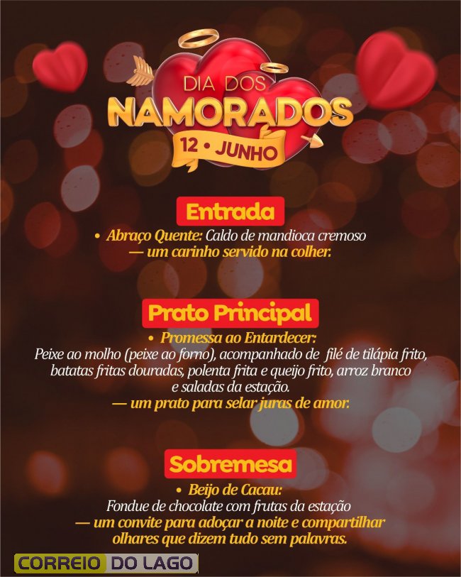 Ricardo Rubner, responsável pelo espaço, esteve no estúdio do Correio do Lago e trouxe os detalhes do evento. Segundo ele, o jantar do dia 12 de junho contará com um cardápio diferenciado: entrada, prato principal à base de peixe assado no forno e uma sobremesa especial, um fondue de frutas preparado pela esposa de Ricardo.