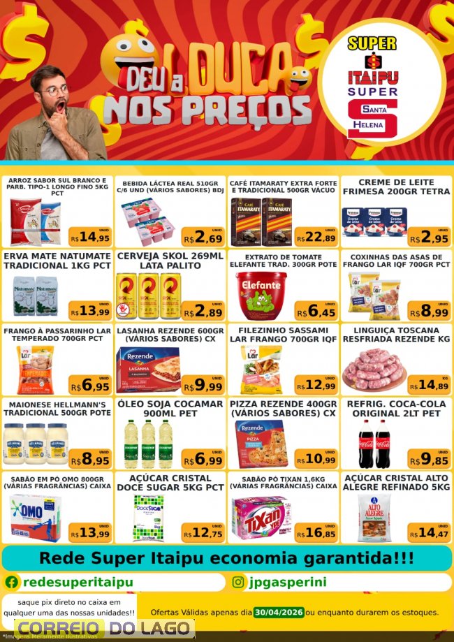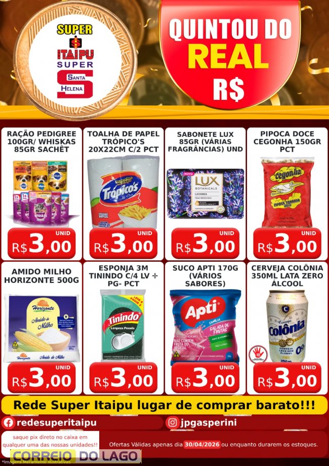 As condições são válidas apenas para está Quinta-feira (30), ou enquanto durarem os estoques. Mais informações podem ser conferidas diretamente nas lojas Super Itaipu e Super Santa Helena.